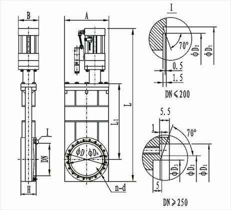 型号 | 通径(DN) | ΦD | ΦD0 | ΦD1 | ΦD2 | ΦD3 | H | A | n-d | L | L1 | B | 法兰标准 |